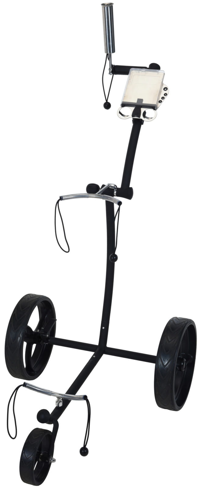 Pchany wózek wykonany ze stali nierdzewnej malowany czarnym matem. Świetnie wyważona konstrukcja i duże koła ułatwiają transport nawet najcięższej torby na grząskim gruncie.